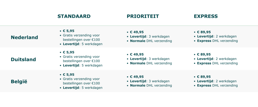 - Bestellingen worden verzonden via standaard DHL-levering.
